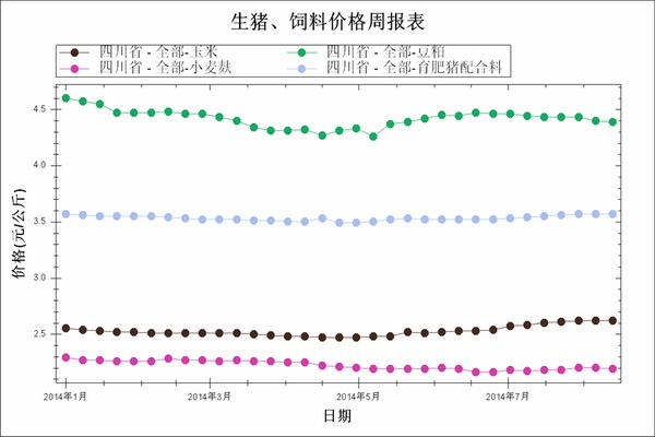 图6 2014年1月~8月第2周饲料原料及配合料均价走势图