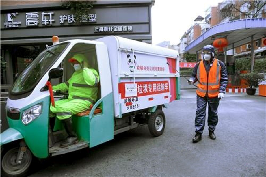 成都市环卫正在为废弃口罩等特殊有害垃圾专用车消毒