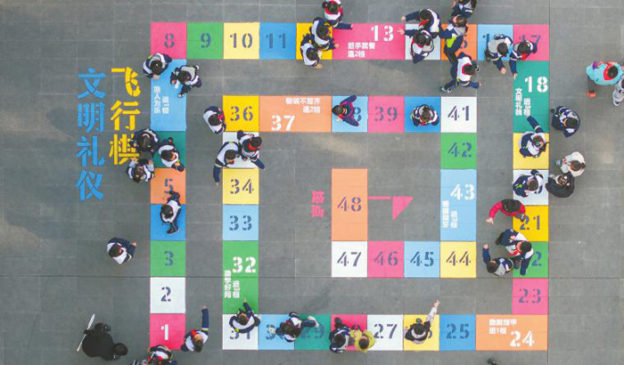 近日,眉山市彭山区鹏利小学孩子们课间在操场上玩文明礼仪飞行棋游戏。翁光建 摄(C视觉)