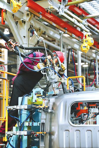 近日,遂宁市安居经开区的四川江淮汽车有限公司的冲焊车间内,工人正焊接车辆部件。公司计划一季度下线车辆4000台,拿下今年的“开门红”。 刘作鹏 摄