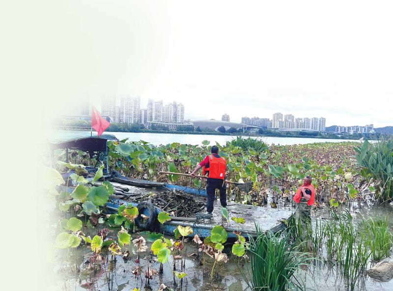 遂宁市船山区圣莲岛,工作人员正在巡河。记者 阚莹莹 摄