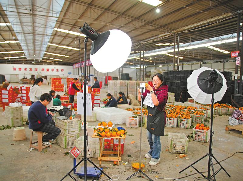 村企合建的柑橘分选基地内,工作人员分拣新采柑橘,同步通过网络直播带货。记者 韦维 摄