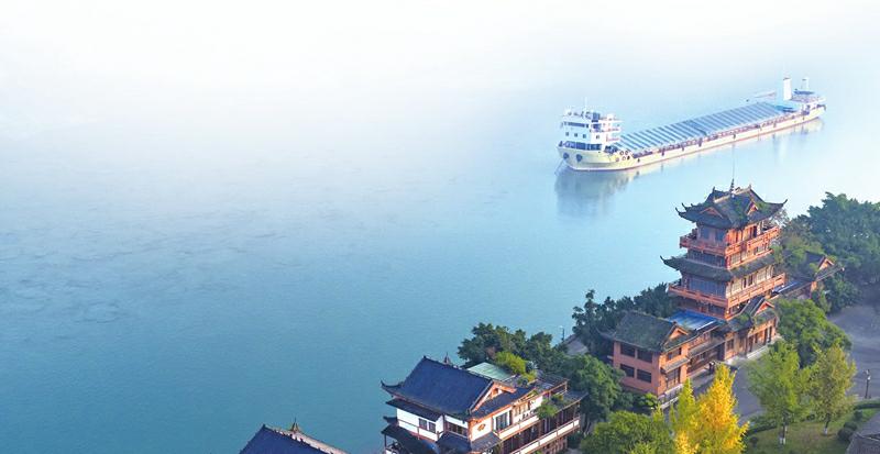 冬日晨雾中,一艘货轮停泊在宜宾李庄古镇奎星阁外的江面上。张华 摄(C视觉)