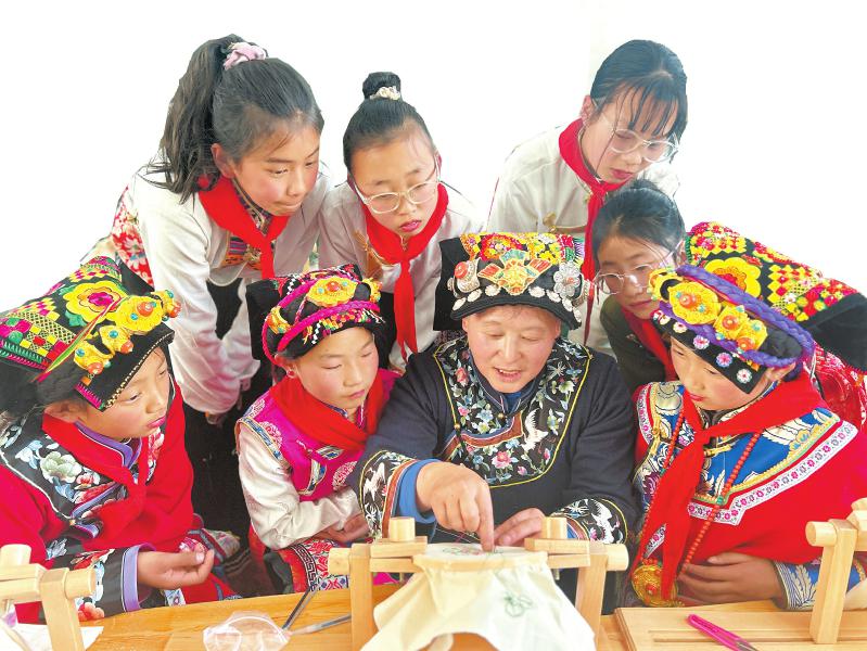 非遗代表性传承人走进校园教授各族学生非遗技艺。 阿坝州民宗委供图