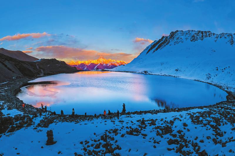游客在康定市沙德镇观德结湖观赏日照金山。本组图片由 邹丽君 摄