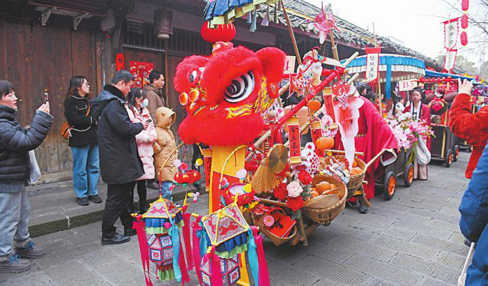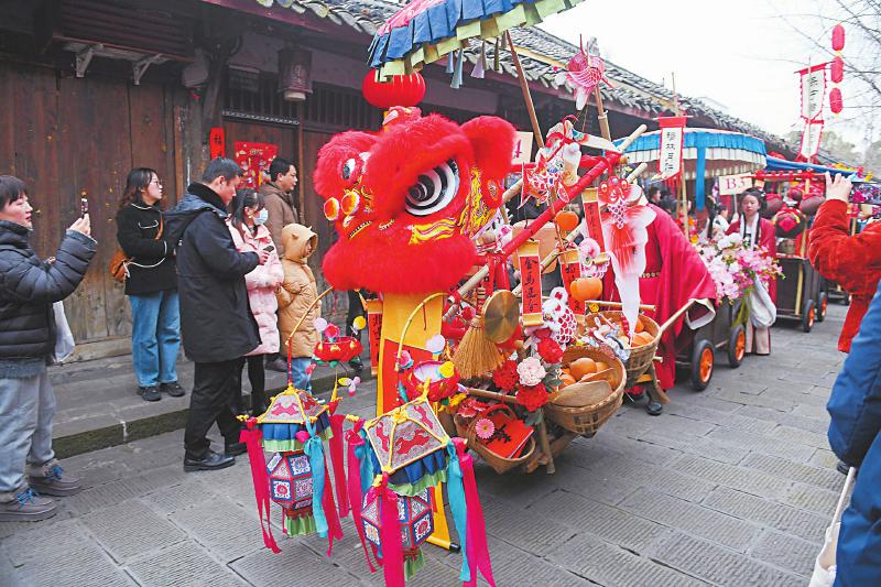 1月21日,锦绣四川非遗赶大集活动在阆中古城举行。图为非遗货郎队伍在古城街道巡游。王玉贵 摄(C视觉)