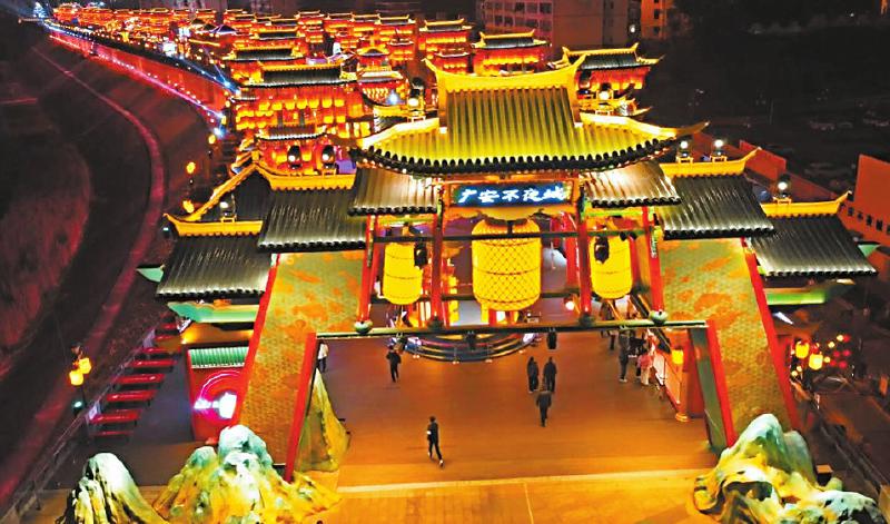 位于广安主城区的广安不夜城则为游客带来了一场宋代街景体验。全长约800米的沉浸式宋韵主题街区,通过仿宋建筑、灯光秀与情景演艺,再现宋代市井繁华。春节期间,这里围绕“宋韵年味”推出系列节庆活动,重点包括“广安奇妙夜”水上沉浸式演艺、“龙腾賨城·狮舞盛世”民俗巡游等。街区还设有7个大舞台,轮番上演各类节目。游客还可身着古装游于街巷,欣赏传统技艺。(记者 阚莹莹)