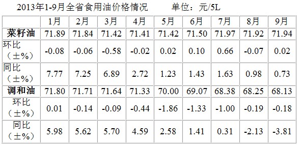 今年油菜籽收购价格高于上年,1-9月菜籽油价格水平也均高于上年同期水平。大豆调和油由于进口大豆量增加,货源充足,在供应较宽松的情况下价格持续处于弱势运行状态,7月以后价格同比下降。总体上看,1-9月全省食用油价格走势平稳。截至9月底全省菜籽油、调和油价格分别为71.94元/5L,68.13元/5L,平均较上年底下降了2.55%,环比略降0.07%。