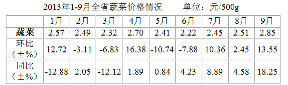 1-9月全省蔬菜价格波动较为频繁:1月,因春节供应及需求变化影响,价格有所上涨;2-3月随着天气变暧和经营正常化,供应增加,菜价持续下降;4月受省内旱情影响,价格迅速回升;5-6月随着旱情缓解以及夏季蔬菜上市量增多,价格回落;7-9月价格持续上涨:一是因7月全省多地遭遇暴雨天气、泥石流断道,蔬菜生产,运输均受到影响,拉动价格上涨。二是8月入秋以来受“秋淡”影响而加速上涨,中秋节前达到今年以来的最高水平2.89元/500g,中秋以后涨幅开始回落。