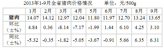 2013年1-9月全省城市居民食品价格监测专项分析