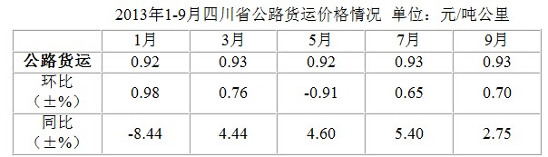 公路货运价格的走势来主要受国家调整油价的影响而变化,受8月30日和9月13日两次上调成品油价格的影响,9月下旬我省公路货运价格达到0.93元/吨公里,环比上涨了0.70%,较上年底上涨2.19%。