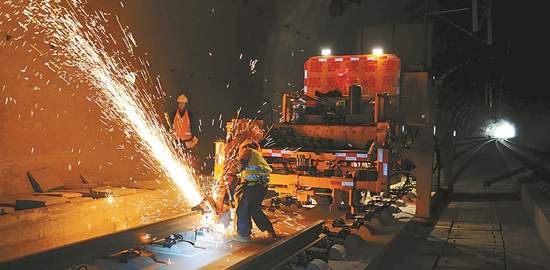 图为工人正在新皇泽寺二号隧道内切割轨道。 (记者 何海洋 摄)