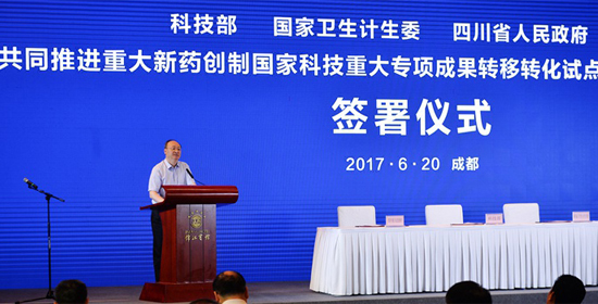 6月20日,科技部、国家卫计委、省政府在成都签署框架协议,决定共同推进重大新药创制国家科技重大专项成果转移转化试点示范。省委副书记、省长尹力出席并讲话。