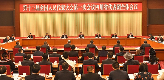 3月3日下午,出席第十三届全国人民代表大会第一次会议的四川代表团在驻地举行全体会议。(毛漫丁)