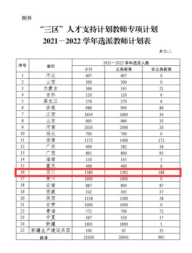 根据附件获悉,四川将在2021—2022学年选派1580名教师,义务教育阶段计划选派1392名教师,非义务教育阶段计划选派188名教师。 (袁菡苓)