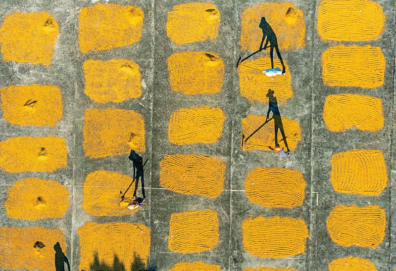 8月3日,科研人员在四川省农业科学院水稻高粱所泸州基地晾晒水稻新材料,每个方格就是一种水稻新材料。