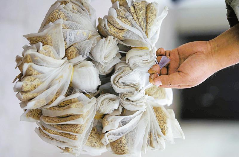 4月21日,科研人员提着从海南基地带回的水稻材料去泸州基地试验田。