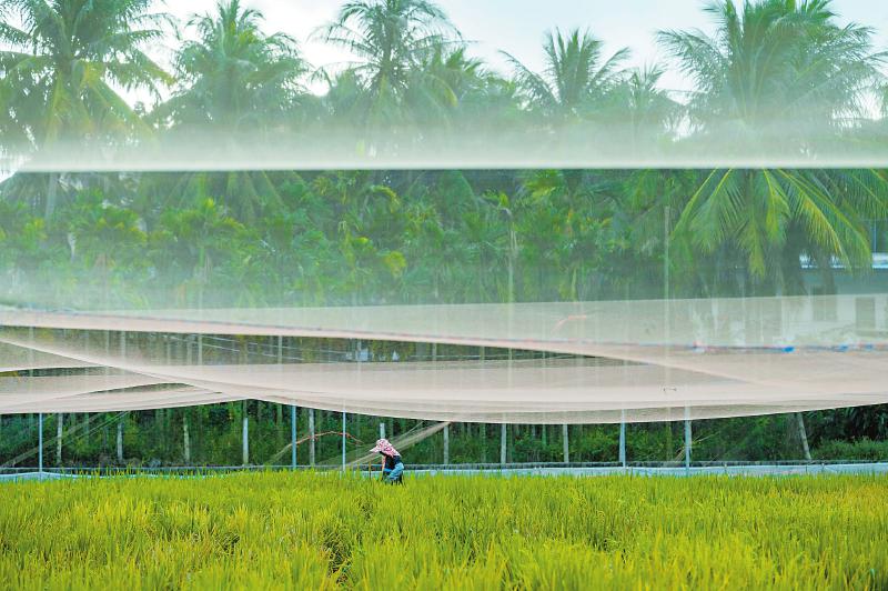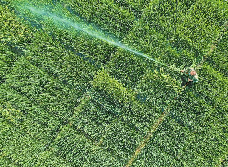 6月25日,科研人员在泸州基地的稻田中喷洒防虫药。