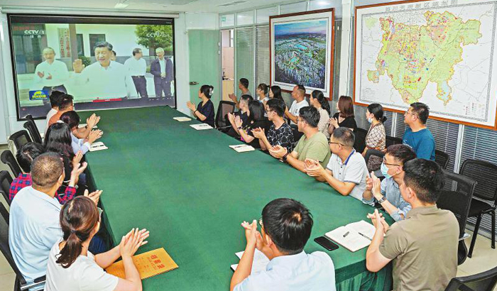 6月9日晚,四川天府新区公园城市建设局党员干部收看中央广播电视总台新闻联播播出的习近平总书记在川考察的新闻报道。记者 何海洋 摄