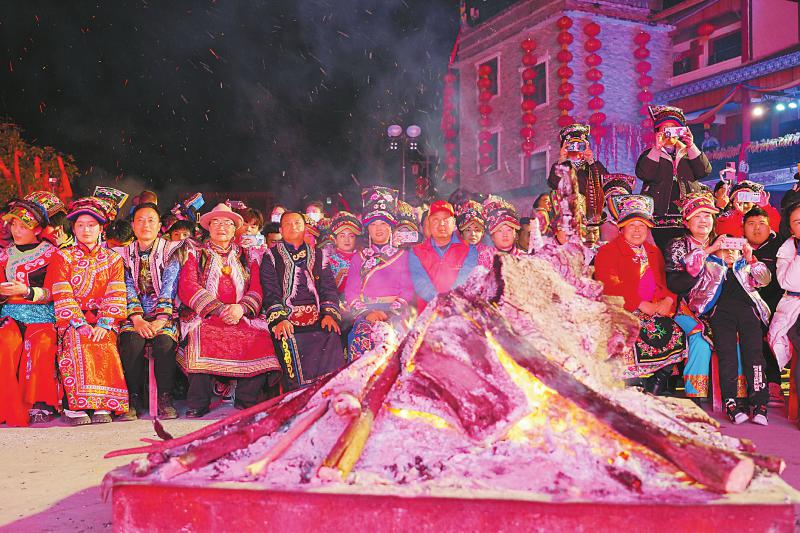 1月18日晚,绵阳市北川羌族自治县曲山镇石椅村的坝坝里,村民们穿上民族服装,围坐在篝火旁,收听收看习近平总书记春节前夕视频连线看望慰问基层干部群众新闻报道。郭超英 摄