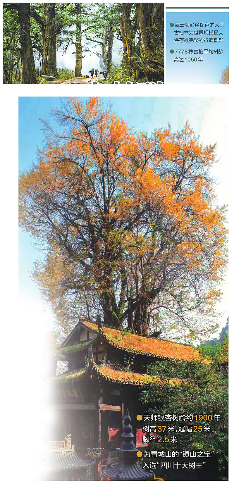 青城山古建筑群天师洞·天师银杏,包括全国重点文物保护单位青城山古建筑群天师洞和树龄约1900年的银杏。天师洞道观始建于隋大业年间(605—618年),现存建筑主要为清康熙年间重建。古建筑群在选址、总体布局、建筑空间处理等方面达到很高水准,是世界文化遗产“青城山—都江堰”的重要组成部分。天师银杏位于“第五洞天”道观中,树高37米,冠幅25米,胸径2.5米。古树如塔耸立,气势雄浑,与天师洞古建筑群交相辉映,极具审美价值。该树具有厚重的历史文化承载,为青城山的“镇山之宝”,于2020年12月入选“四川十大树王”。(记者 吴晓铃 陈俊伶)