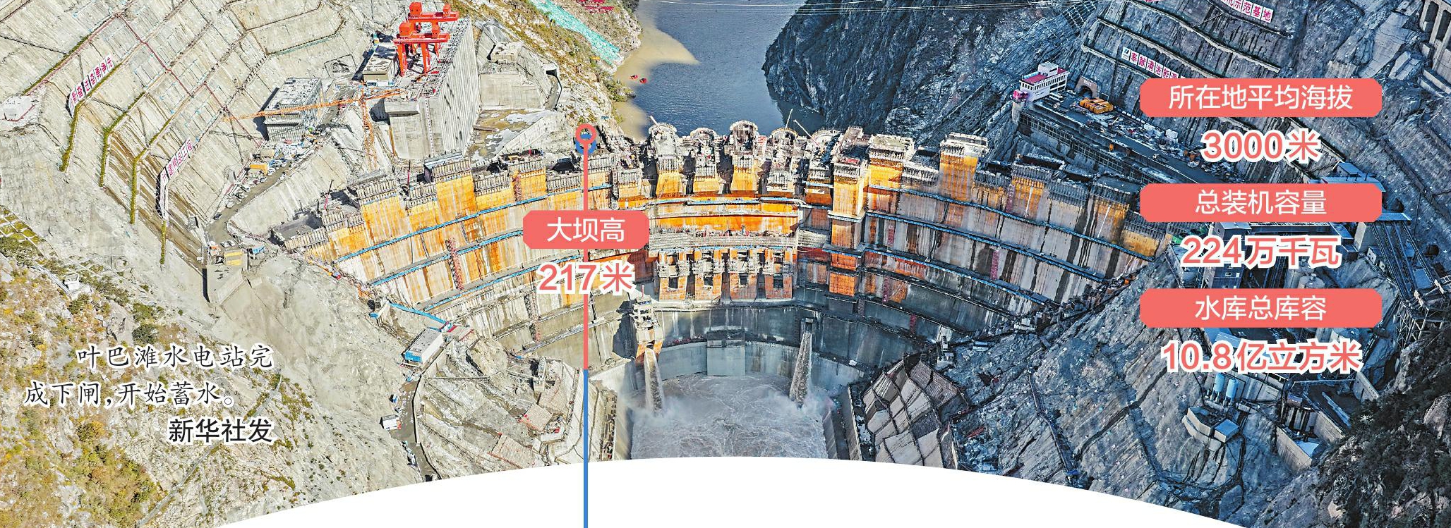 叶巴滩水电站位于四川省白玉县与西藏自治区贡觉县交界的金沙江干流上,是国家“十四五”规划重点建设的金沙江上游清洁能源基地的重要组成部分。电站所在地平均海拔3000米,总装机容量224万千瓦,水库总库容10.8亿立方米,建设中的217米高大坝是我国在建海拔最高的混凝土双曲拱坝。2022年8月开始大坝混凝土浇筑,2025年9月实现首批坝段浇筑到顶,计划今年底首批机组投产发电。