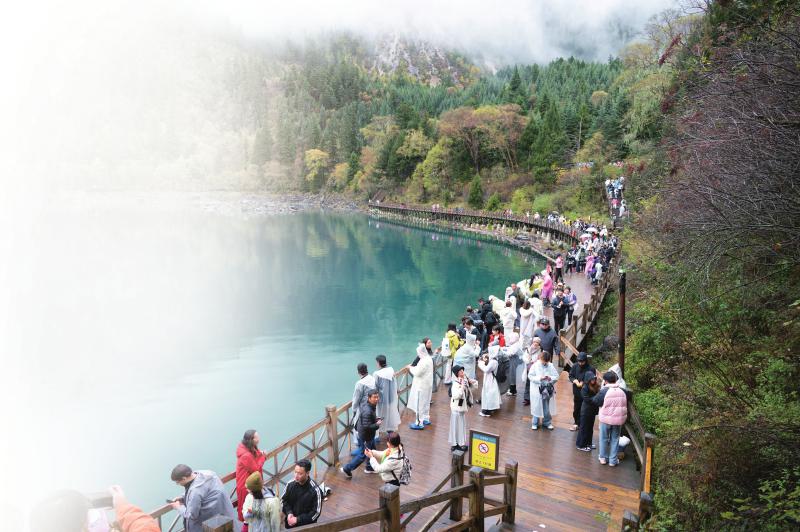 10月20日,尽管小雨淅沥,但仍未影响游客们游览九寨沟的热情。唐磊 摄(C视觉)