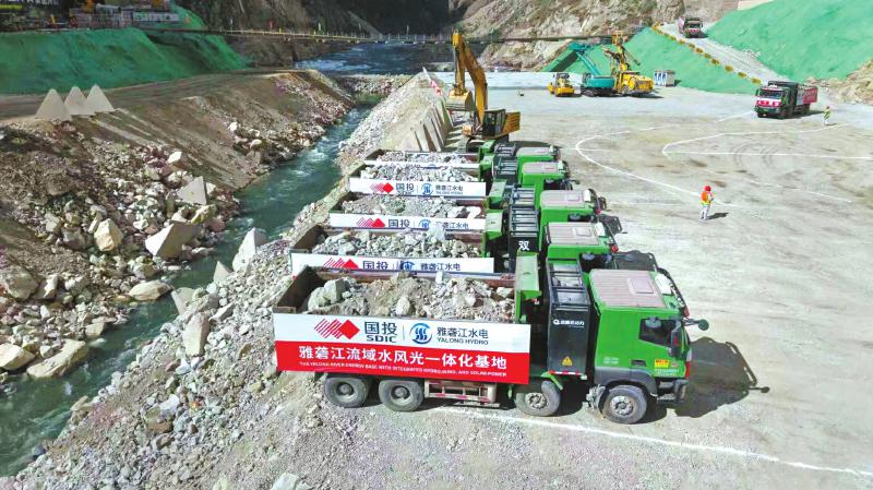 在雅砻江孟底沟水电站截流现场,多辆新能源自卸车不间断地运输石料。