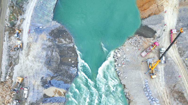 在截流施工中,雅砻江公司通过开展精准水文预报、截流模型试验、优化施工方案、组织截流演练等多种举措,实现了安全、高效、精准截流。牙根一级水电站采用双向立堵截流方式,截流最大落差约3.5米,最大流速约5.7米每秒。孟底沟水电站创新施工工法,采用“丁字坝进占挑流”,将导流洞分流比从50%提升至90%以上,截流施工落差降低至4.8米,大幅降低了截流难度,有效提升了截流便利性和安全性。截流过程中,两座电站总共抛填石料约9万立方米,历时不到30个小时。