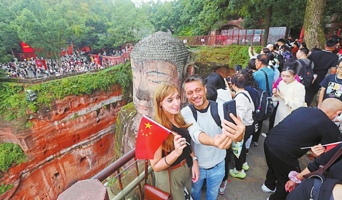 10月1日,外国游客在乐山大佛景区拍照。李华时 摄