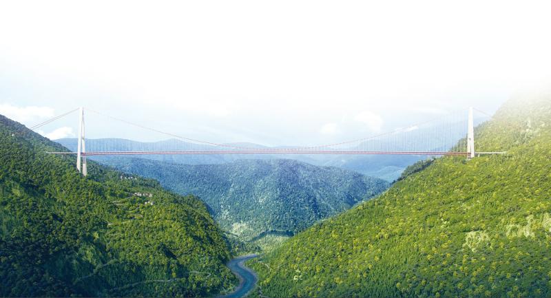 既要考虑高速公路的线性布局,又要对接支线互通,泸沽湖特大桥的选址极为苛刻。大桥横跨卧罗河,桥面到水面落差高达500米,受地形限制,大桥被“逼”出三项世界之最:世界最大跨径空间缆悬索桥、山区世界最大跨径钢桁梁悬索桥、世界最大U型隧道锚。
