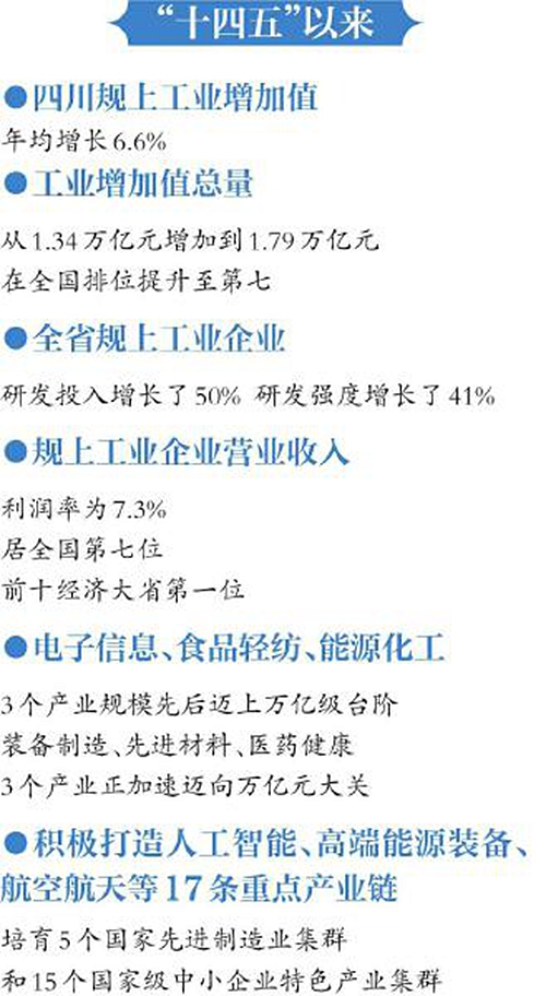 “十四五”时期,四川规上工业企业研发投入、研发强度分别增长50%、41%;规上工业企业营业收入利润率为7.3%,居全国第七、前十经济大省第一位。