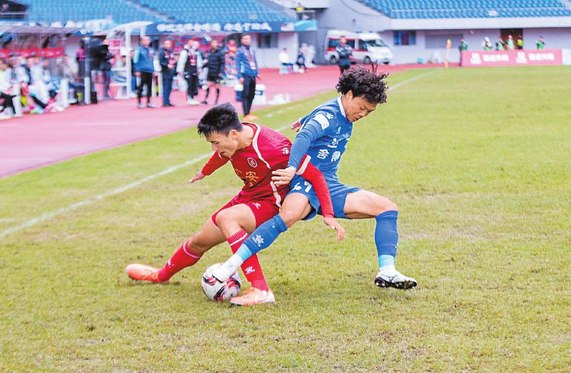 11月10日,遂宁舍得干队与广安板楯蛮队在比赛中激烈拼抢。