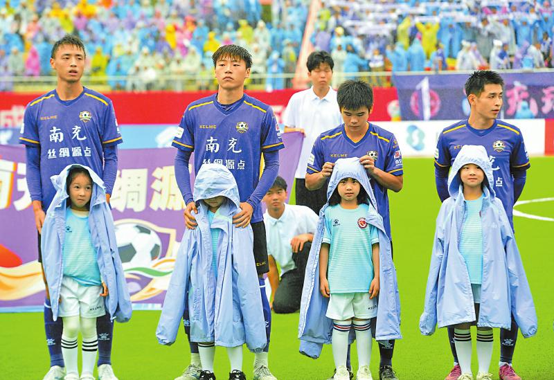 10月19日,南充丝绸源点队主场迎战成都锦城队。赛前突降小雨,南充队球员主动脱下外套为小球童遮雨,场面温馨。