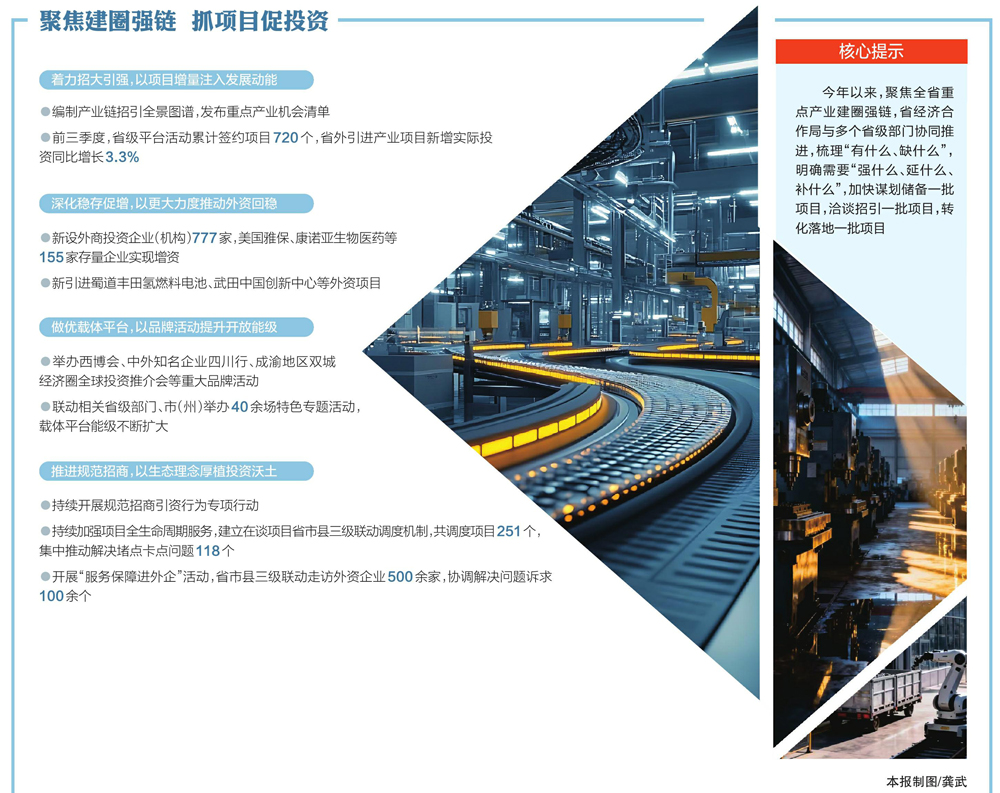 “精准”二字,还体现在客商邀请的变化上:今年以来,四川省级层面的投资推介活动紧扣“17+N”重点产业链发展所需,精准邀请产业链条上紧密关联的企业客商,以项目招引落地加快推进强链延链补链。