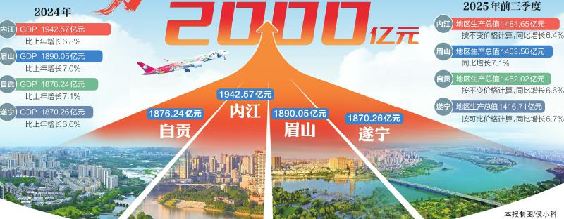 2025年收官在即,四川经济版图的“黄金腰部”发力冲刺——内江、眉山、自贡、遂宁四地今年的经济发展目标均剑指2000亿元以上;前三季度地区生产总值均已超1400亿元,距离年度目标均不到600亿元。
