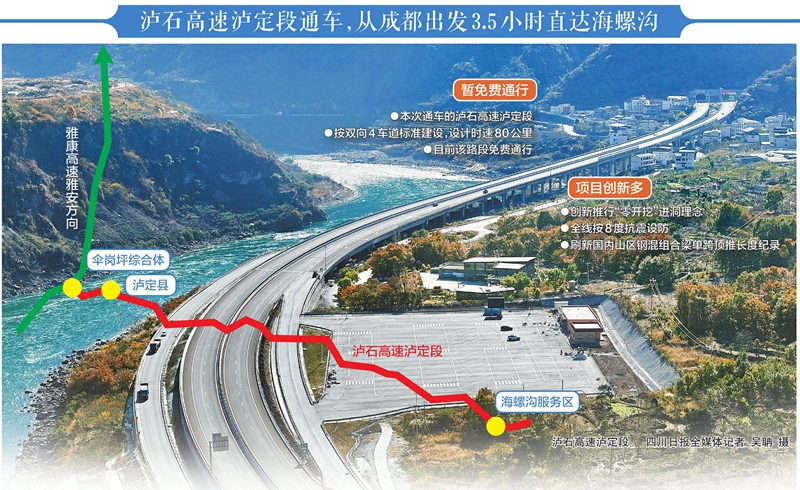 这也是一条交旅融合之路。从泸石高速海螺沟收费站下高速,便可直达海螺沟景区。“过去驾车从成都到海螺沟,要先走高速到泸定县城,再转省道前往景区,全程需四五个小时;现在从成都到海螺沟全程高速,通行时间显著缩短。”泸定县交通运输局副局长向勇说。