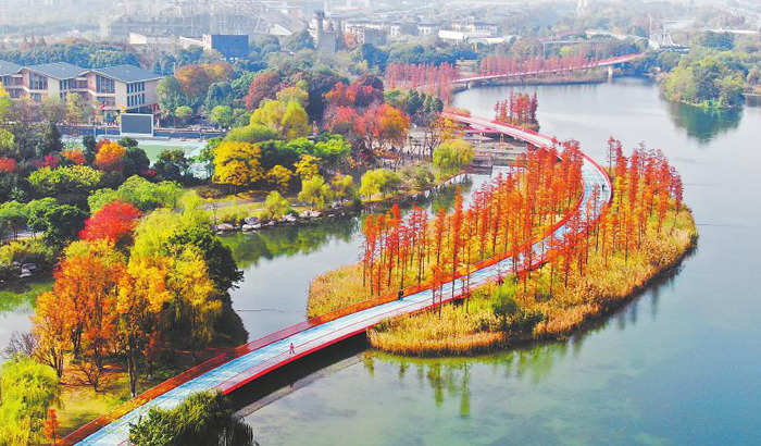 12月2日,成都锦城湖畔水杉林渐染暖红,倒映在澄澈湖面。日前,外交部发言人在海外社交媒体向全球推荐这一美景,称其为“冬季赏色理想去处”,让成都的自然景致收获国际广泛关注。记者 郝飞 摄