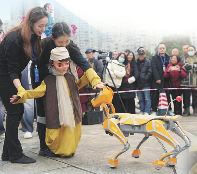 12月4日,第四届南充国际木偶艺术周街头巡演现场,机器狗与木偶互动。余中华 摄(C视觉)