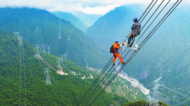 5月26日,在甘孜藏族自治州康定市日地村,高空电力工人检查输电线路的导线及各类附件。张超 摄(C视觉)