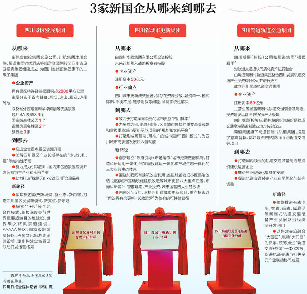 7月28日,四川景区发展集团、四川省城市更新集团、四川蜀道轨道交通集团在成都正式揭牌成立。