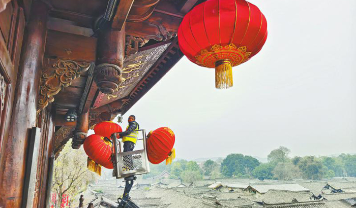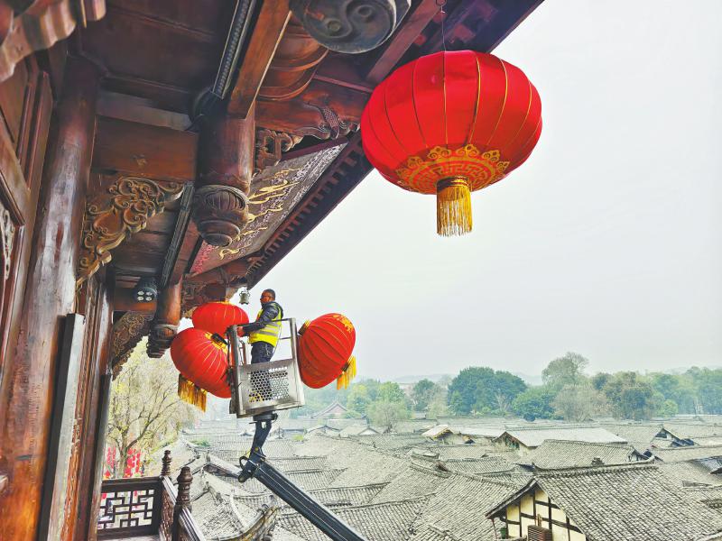 1月18日,南充阆中古城中天楼,工人安装大红灯笼。梁德 摄(C视觉)