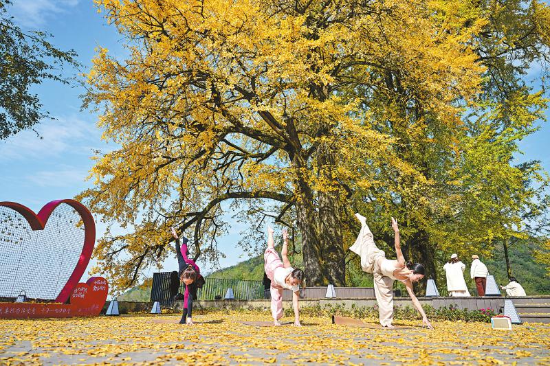 华蓥市红岩乡红岩村,游客在银杏树下练习瑜伽(资料图片)。张国盛 摄(C视觉)