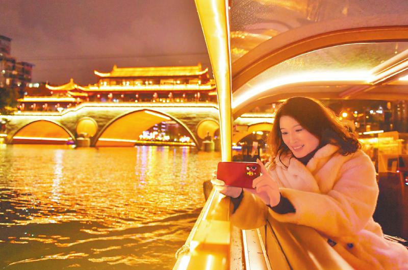 1月2日晚,成都“夜游锦江”活动游人如织,游客乘船赏景、逛集品美食,在桨声灯影间感受城市夜经济活力。