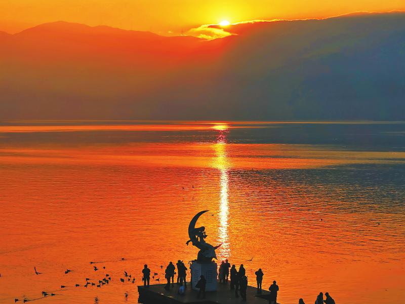 新年第一天,游客在邛海朝阳中与自由飞翔的海鸥同框,构成一幅温暖浪漫的冬游四川画卷。