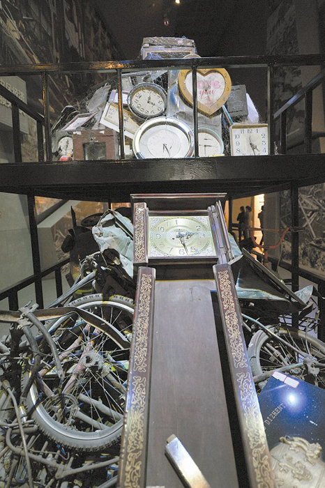 电风扇、自行车、水壶、饮水机……各种从废墟中抢救出的生活用品,无不凝聚沧桑。其中,有几座时钟引人注目,它们的指针永远定格在“2点28分”。其中一座最大的时钟油漆已经脱落,外表也已斑驳,是从北川老县城里抢救出来的。在一个灯光暗淡的角落,一个鞋架上摆放着100多双男女老少的鞋子。这些鞋子全是从废墟中刨出来的,在展出前,为尊重逝去的生命以及从卫生防疫考虑,工作人员进行了仔细地清洗。