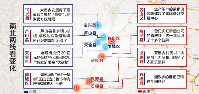 其中,北线记者探访雨城区、芦山县、宝兴县和天全县,南线记者途经名山区、荥经县、石棉县和汉源县,累计行程上千公里,走农家、进园区、入工地,感受灾区一年的动人变化。