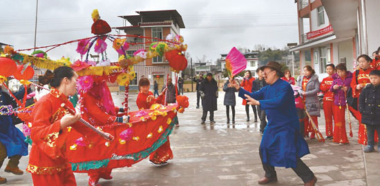 1月29日上午,伴随着领衔人唐朝科(右一)的吆喝和比划,达州市开江县甘棠镇转洞桥村村民活动中心上演了一场一年一度的民俗节目——踩龙船,穿红戴绿的队员们应声起舞。