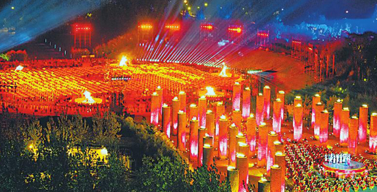 2017年春晚凉山分会场火把广场演出场地,象征56个民族大团结的图腾柱燃起火焰。冷文浩 钟源 摄(资料图片)