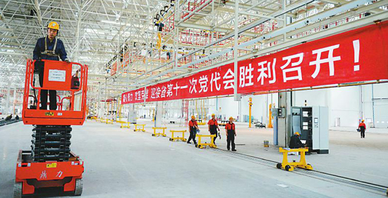 5月22日,在吉利南充新能源商用车研发生产项目总装车间,迎接省第十一次党代会召开的标语十分醒目。